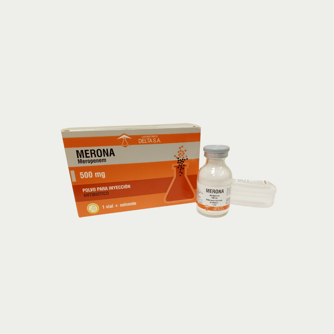 MERONA se presenta en vial x 20 mL. Caja x 1 vial + diluyente agua estéril x 10 mL + prospecto.